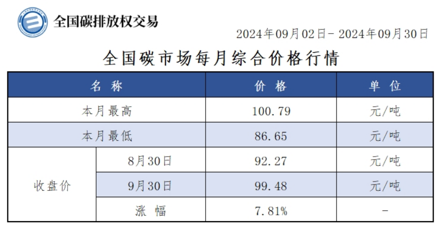 本月全国碳市场综合价格行情为:最高价100.79元/吨,最低价86.65元/吨,收盘价较上月最后一个交易日上涨7.81%。