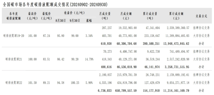 全国碳市场每月综合价格行情及成交信息20240902-20240930