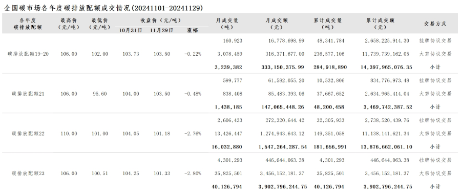 全国碳市场每月综合价格行情及成交信息20241101-20241129