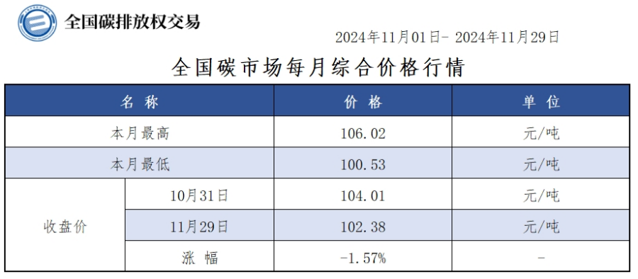 本月全国碳市场综合价格行情为:最高价106.02元/吨,最低价100.53元/吨,收盘价较上月最后一个交易日下跌1.57%。