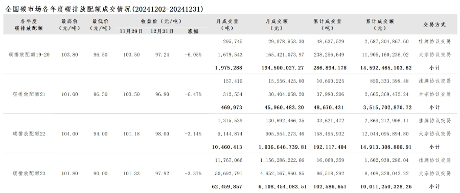 全国碳市场每月综合价格行情及成交信息20241202-20241231