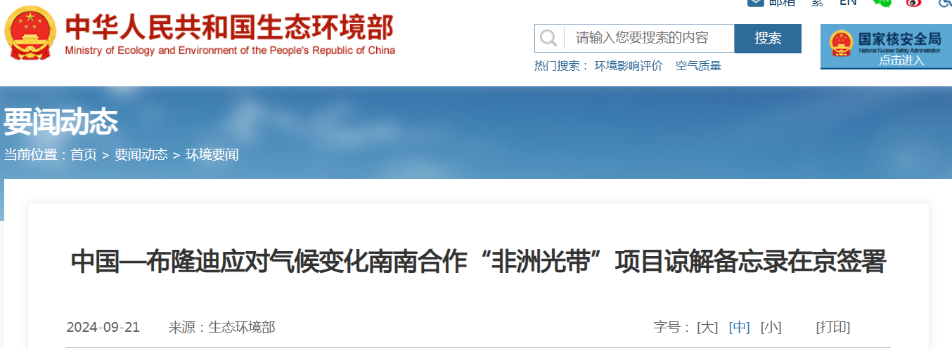 近日,在中非合作论坛期间,中国生态环境部与布隆迪水利、能源与矿业部在京签署关于合作开展应对气候变化南南合作“非洲光带”项目的谅解备忘录(以下简称“合作谅解备忘录”)。这是中国自启动“非洲光带”项目以来签署的第5个合作项目。